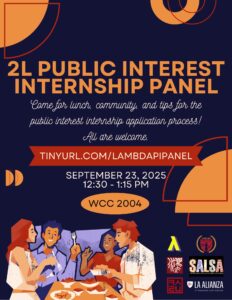 Join Lambda, WLA, APALSA, La Alianza, SALSA, and KAHLS for a Public Interest Internship Panel on Tuesday, September 23! Hear from a diverse group of…