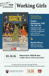 Please join us for a screening of Working Girls followed by a discussion with Prabha Kotiswaran, LLM ’96, SJD ‘06, Professor, King’s College London, and…