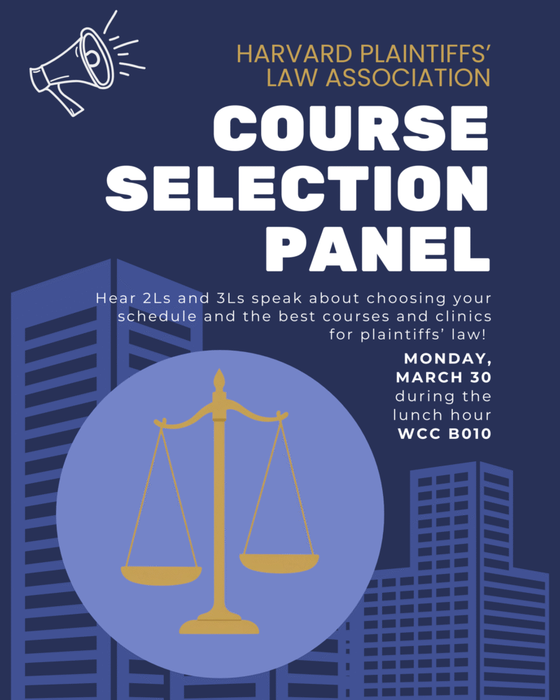 Join the Harvard Plaintiffs Law Association for a student panel on fall course selection. 2Ls and 3Ls will answer your questions about choosing courses to…