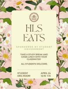 Come enjoy an open lunch with the HLS community. Eat, connect, unwind and build community with classmates and Student Government! All students welcome.