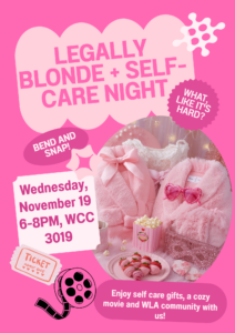 WLA movie and self care night – come relax with us as we watch Legally Blonde, eat some yummy food and get some skincare gifts…