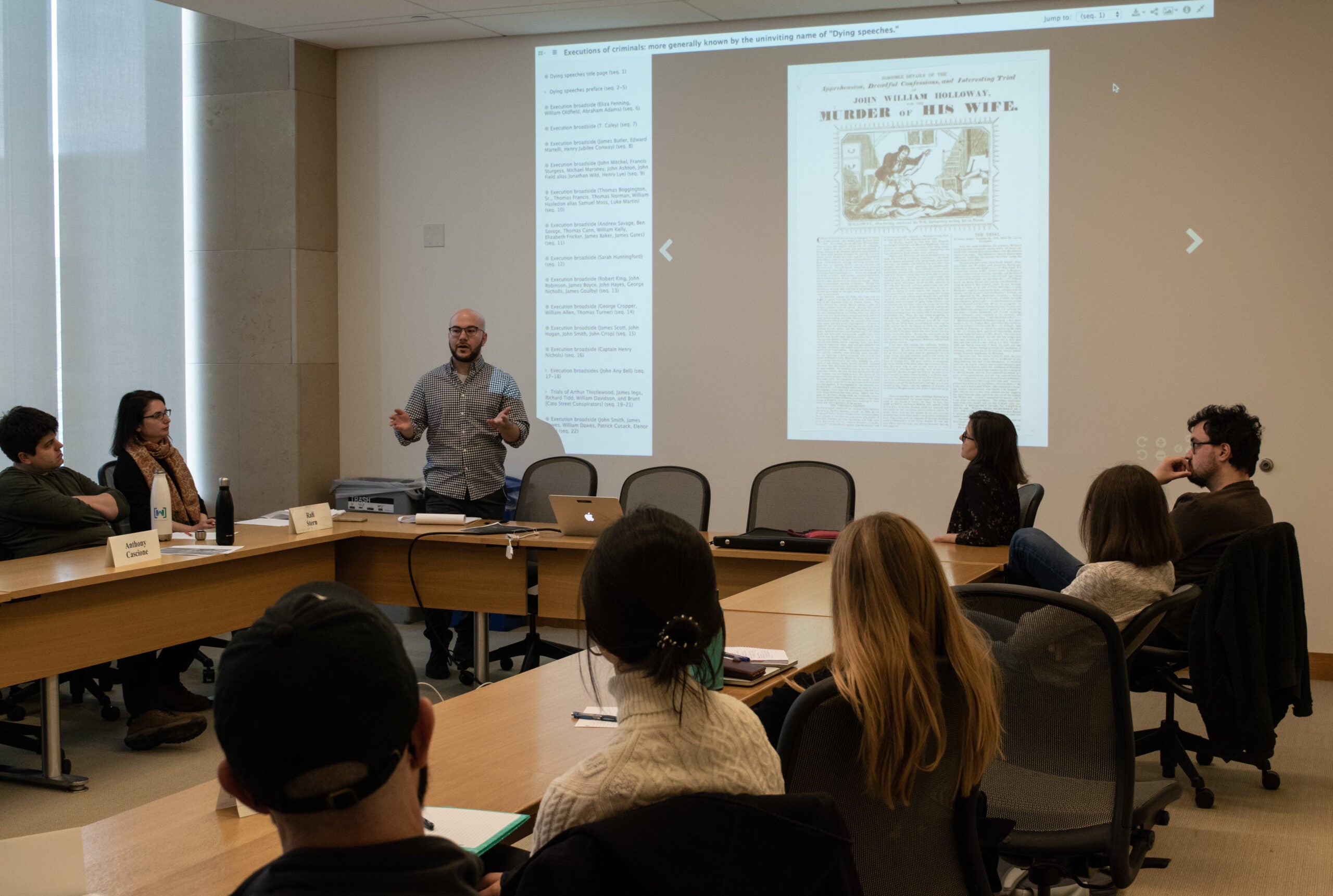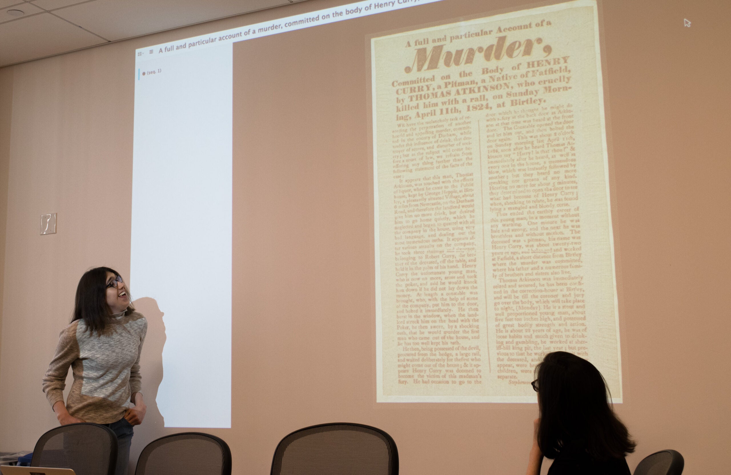 The broadsides “are the most vivid primary source” the students study during the semester, said Kamali. They “permit students to test out the historian’s toolkit: Doing a close reading of the broadside’s text and illustrations, theorizing about the likely audience, and contextualizing the broadside within its broader social and legal context by exploring contemporary evidence of other kinds, such as a transcript of trial proceedings or alternate accounts of the criminal incident, prosecution, or execution.” The Library’s collection of nearly 600 broadsides is one of the largest recorded and the first to be digitized in its entirety. The digitized material spans the years 1707 to 1891 and includes accounts of such crimes as arson, assault, counterfeiting, horse stealing, murder, rape, robbery, and treason.
