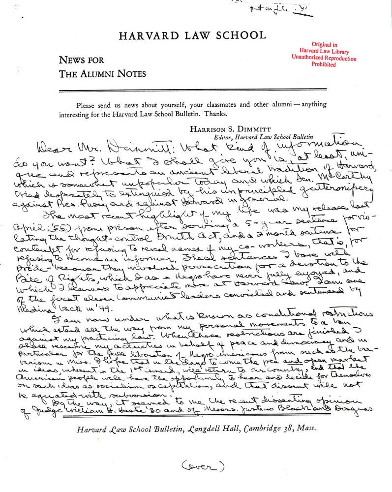 In the 1950s, the HLS Bulletin asked for alumni updates just as it does today. “Please send us news about yourself, your classmates and other alumni—anything interesting for the Harvard Law School Bulletin,” read the form from Harrison S. Dimmitt ’25, the Bulletin editor. Among those who replied was Benjamin J. Davis ’28, a leading figure in the American Communist Party, who was also a civil rights attorney and a former New York city councilman.