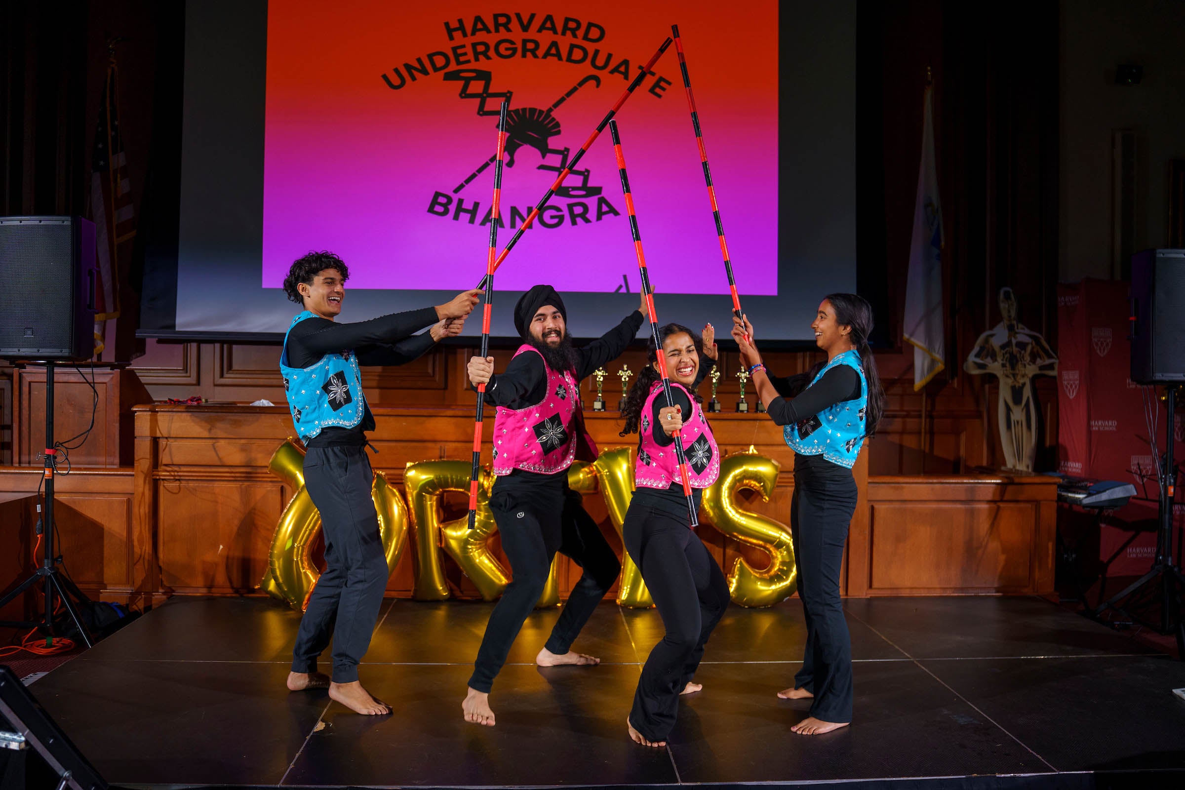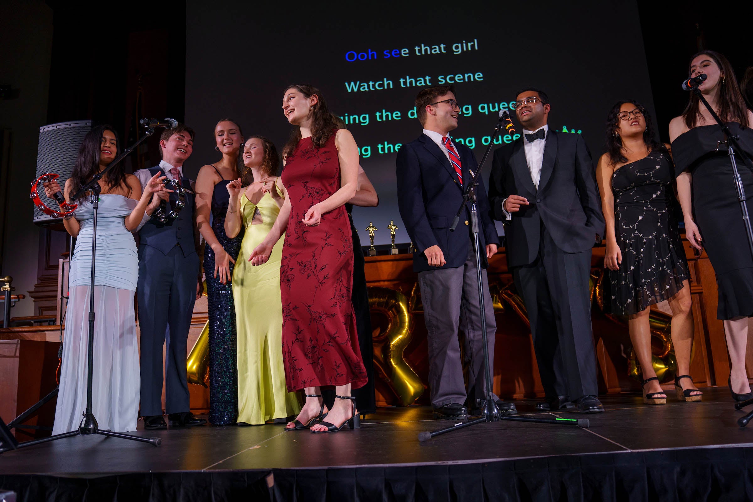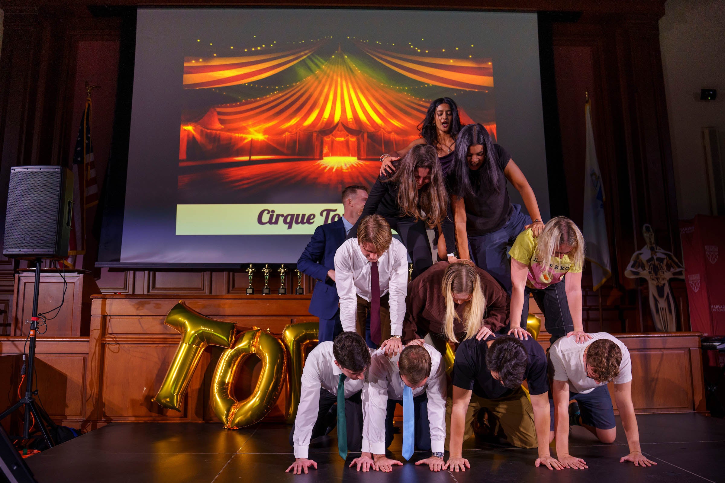 Initially conceived as a way to showcase short films produced by students in Hanson’s Section Six, the Tortys has become a popular event on campus, featuring numerous performances throughout the evening in addition to the presentation of awards. This year featured everything from Bhangra to Blue Man Group, and even some acrobatics — and a human pyramid! — courtesy of “Cirque Tort Soleil.” Members of the Harvard Law School community also turned out to support the event, including Professor of Practice Larry Schwartztol, and Visiting Professor Erin Kelly, who took part in a skit with students.