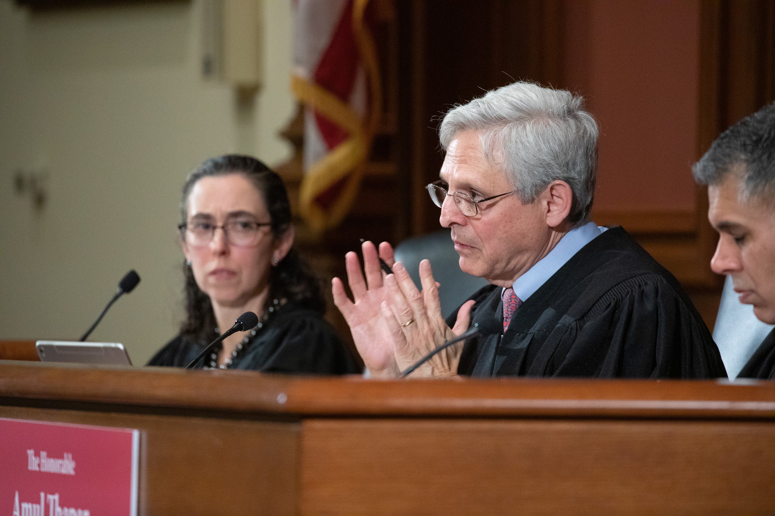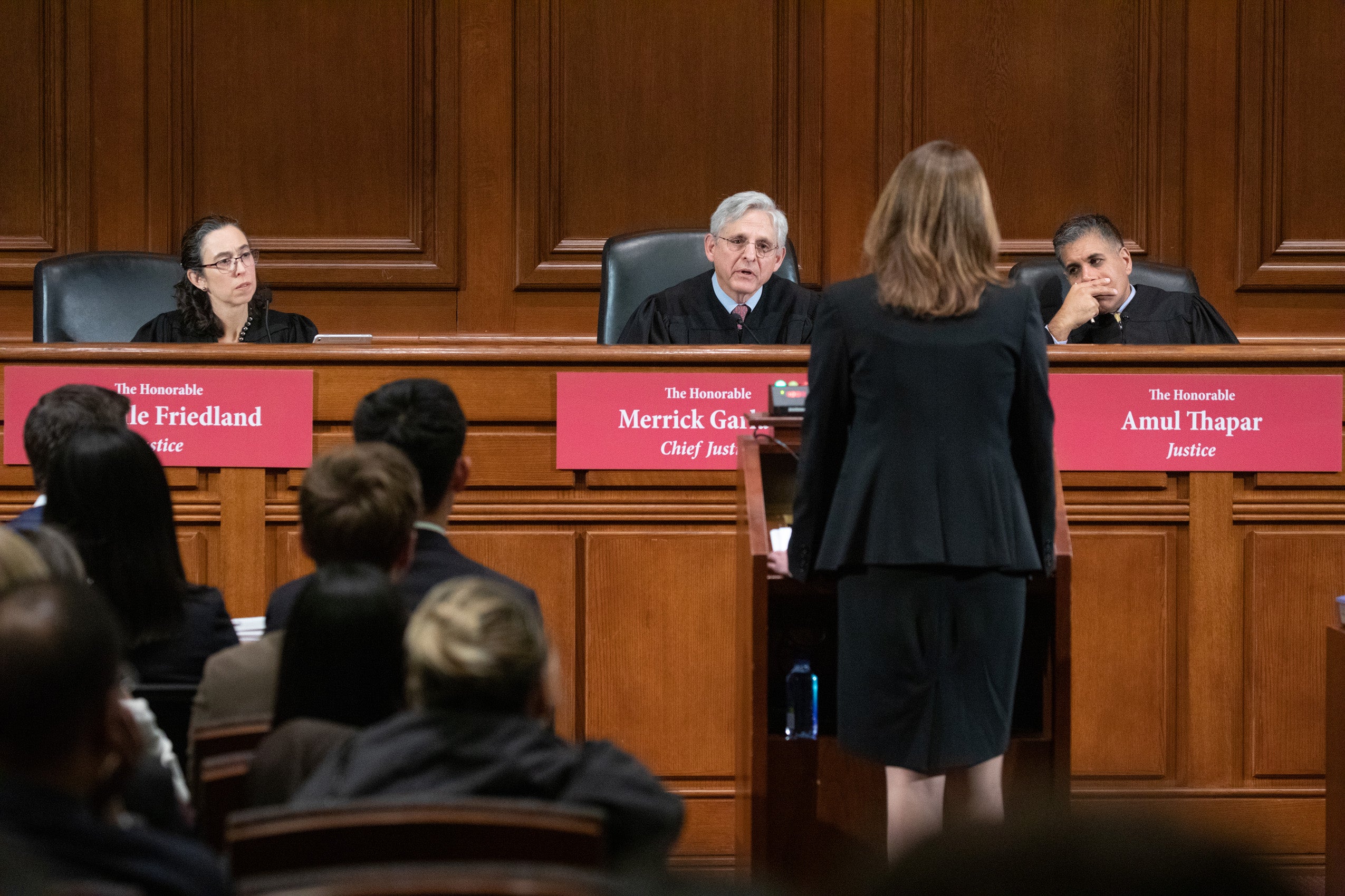This year, Merrick Garland ’77, chief judge of the U.S. Court of Appeals for the District of Columbia Circuit, presided as chief justice. Joining him on the panel were Judge Michelle Friedland of the U.S. Court of Appeals for the Ninth Circuit, and Judge Amul Thapar of the U.S. Court of Appeals for the Sixth Circuit.